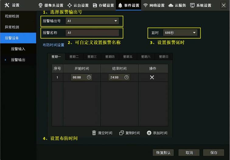 在连接好报警输出设备后,打开NVR的主菜单,进入【设置>事件设置>报警设备>报警输出】页面,按照以下步骤进行设置: