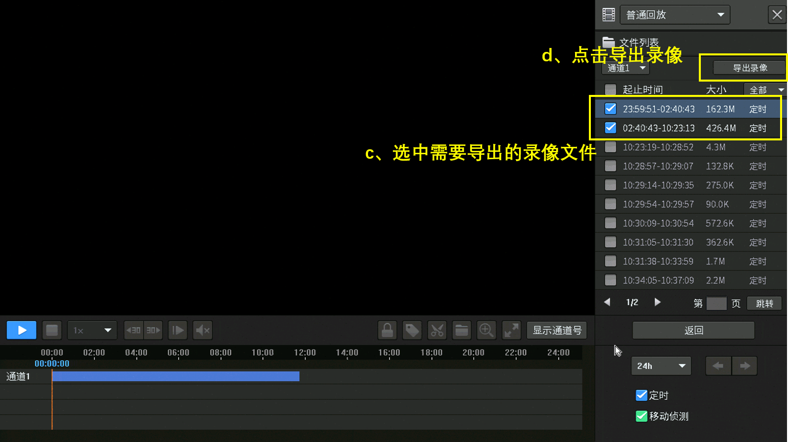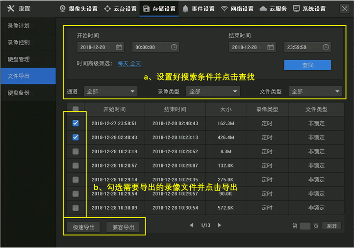 c、在文件列表中通过时间段来判断需要导出的录像文件并勾选;