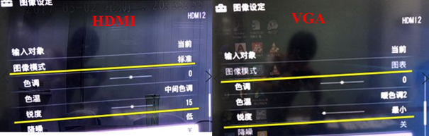 经过对比,我们发现录像机通过HDMI输出到电视机时,电视机选择的图像模式是“标准”,此模式下默认锐度是15,此时,将“锐度”调为0后,画面显示正常;而录像机通过VGA输出时,电视机选择的图像模式是“图表”,此模式下默认锐度是0,所以VGA输入的画面一直正常。