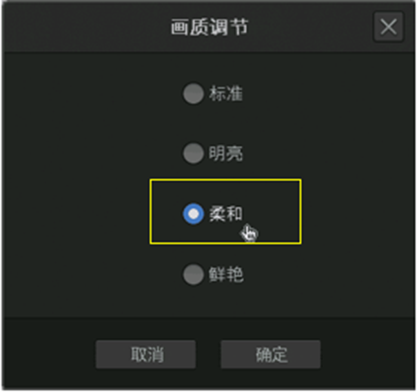 通过主菜单进入录像机的“画质调节”页面,调整图像模式为“柔和”模式,此模式会降低录像机输出图像的锐度: