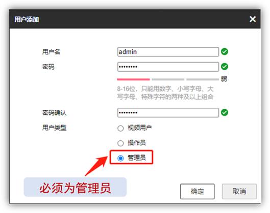 3、点击【添加】,设置一个ONVIF账号,用户类型必须为管理员;