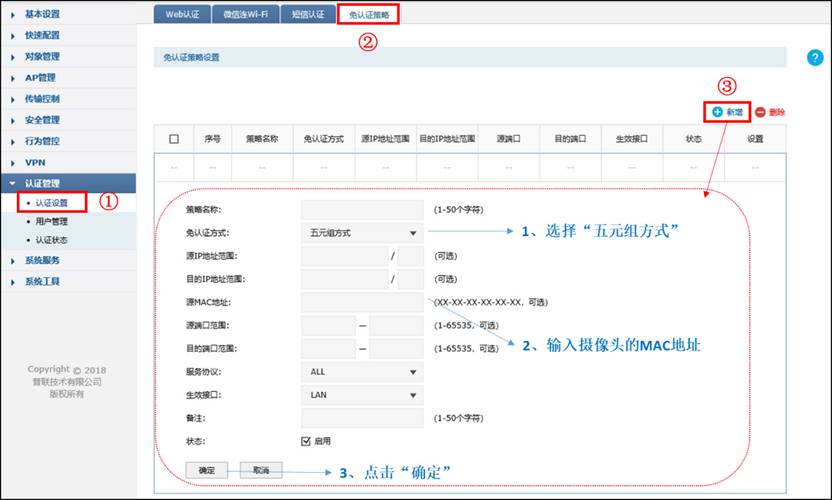电脑进入AC界面,依次点击 “认证管理 ”>“ 认证设置” > “免认证策略”,点击“ 新增”,选择五元组方式,并手动输入摄像机/录像机的MAC地址,完成摄像机免认证上网,即可解决摄像机无法绑定TP-LINK ID问题。