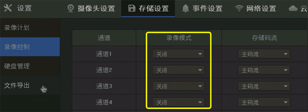 进入“设置>存储设置>录像控制”,查看各通道的录像模式是否开启。
