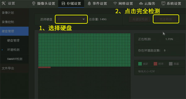 如果录像一段时间后停止录像了,很可能是硬盘故障——硬盘有坏道导致。请进入“设置>存储设置>硬盘管理>坏道检测”,选择相应的硬盘后,点击“完全检测”,如下图: