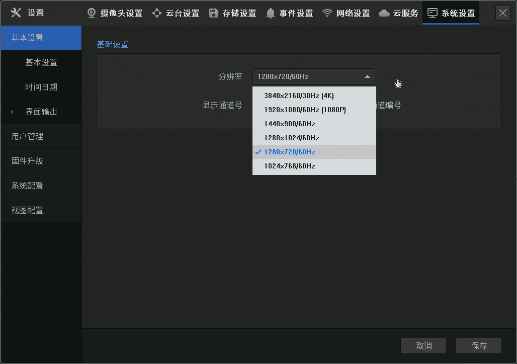 预览界面右键呼出主菜单,点击【设置>系统设置>基本设置>界面输出>分辨率】即可修改输出分辨率。
