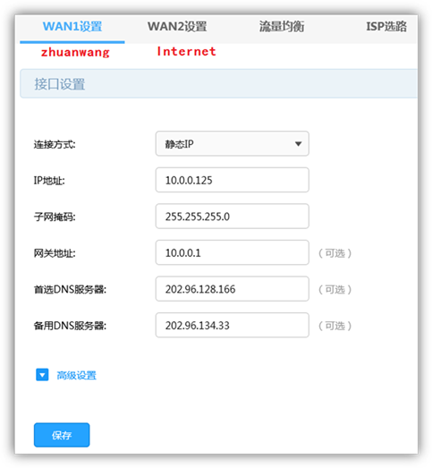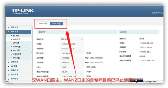 登录路由器界面,点击“基本设置>接口模式”,WAN口数量选择双WAN口。同时在“基本设置>WAN设置”中设置好两个WAN口的网络参数。