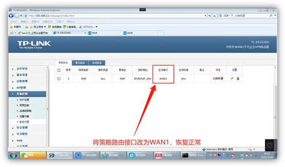 至此,策略路由设置完成,内网电脑访问专网或访问Internet都将按照规则来实现,对于NVR来说,如果要走专网服务器则走专网宽带,如果需要走互联网远程监控,则走公网宽带接口,实现多宽带条件下的正常。