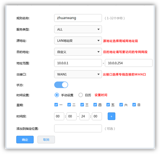 点击“高级功能>路由设置>策略路由”,点击,添加规则将指定访问专网10.0.0.0/24的数据从WAN1口转发,如下图: