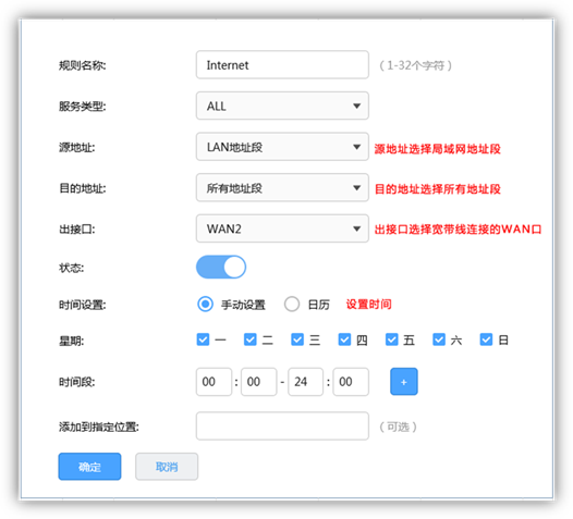 注意:规格名称建议设置英文或数字,勿使用中文。再添加规则,将NVR和其它设备需要指定访问Internet的所有数据由WAN2口转发,如下图: