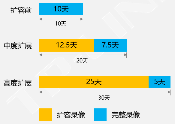 2. 开启扩容存储,扩展模式选择为中度扩展,录像可保存20天,其中早期的12.5天是压缩后扩容录像,近期的7.5天是未经压缩的完整录像;