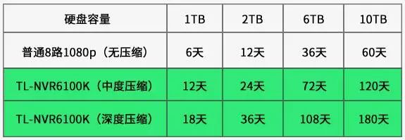 以下是普通录像机和TL-NVR6100K在不同压缩状态下的存储时间对比: