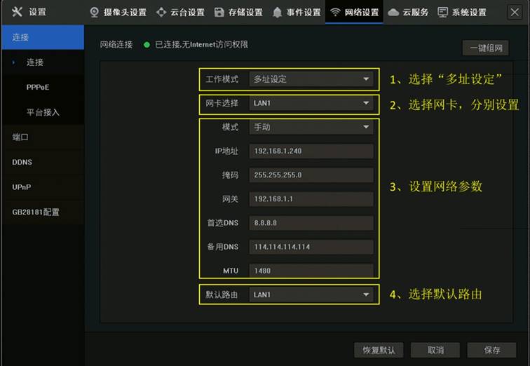 配置方法:将NVR的工作模式设置为“多址设定”,分别选择网卡LAN1、LAN2设置对应网络参数: