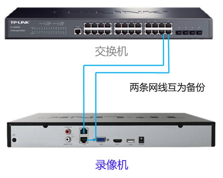 双网口录像机设置为容错模式后,两个千兆网口可以直接连接局域网任意交换机,正常情况下,所有数据流量均通过主网卡传输,备份链路空载。当主网卡的网络出现故障时,系统自动启用备份网卡,确保监控系统稳定运行。