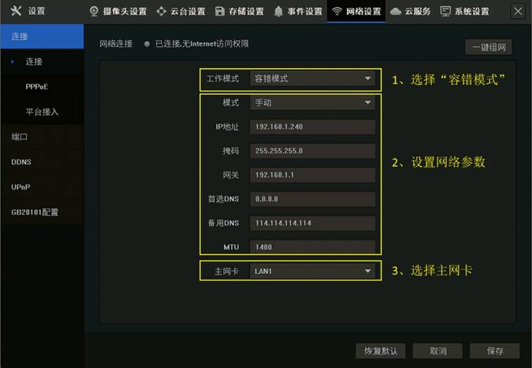 配置方法:工作模式选择“网络容错”,设置网络参数: