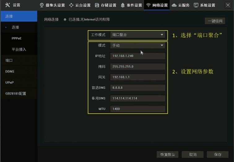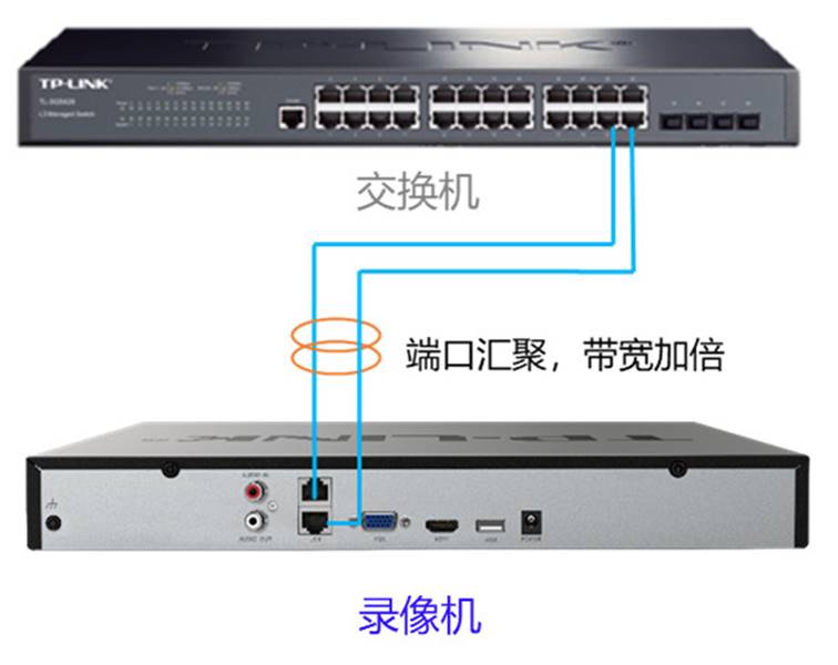 注意:与录像机连接的交换机必须支持设置端口汇聚,才能起到带宽叠加的目的。