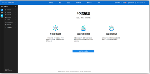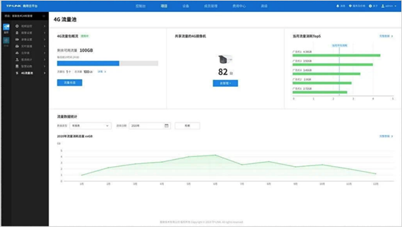 在防疫社区、公园景区、数字乡村等项目场景,由于分布式监控且联网不便,通常采用4G摄像机,通过4G流量,接入TP-LINK商用云平台进行集中监控台管理。而但针对众多4G设备,多台设备逐一购买以及后续不定时充值流量套餐,比较费时费力。新发布的4G共享流量池功能完美解决此问题,具有4G摄像机共享流量、充值续费仅需一次、管理统计等特色功能,实现项目使用省钱不浪费。
