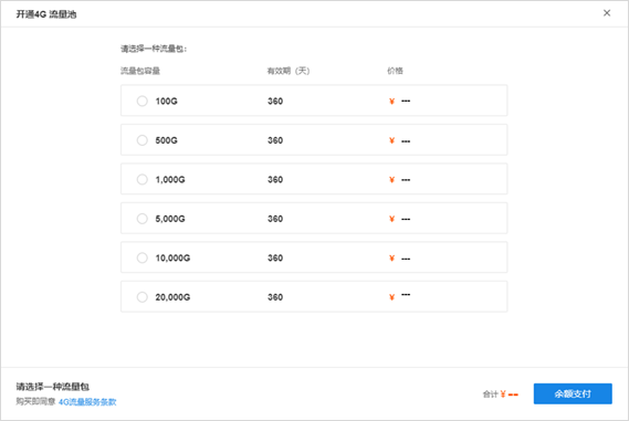 注:4G流量套餐价格以商用云平台实时展示的数值为准。