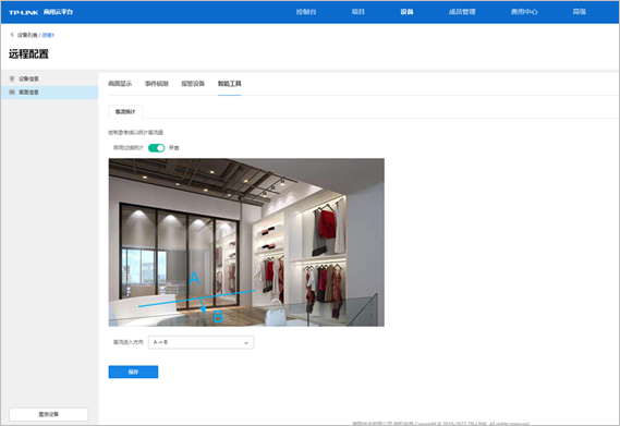并在“设备”列表进入摄像机的远程配置界面,依次点击“画面信息”-“智能工具”,打开客流统计,并绘制合适的参考线。