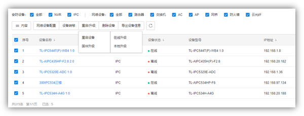 可以批量选择项目分组中的多台在线设备进行远程重启和升级。
