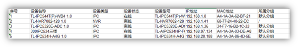 将分组下的所有设备信息以Excel表格形式进行导出,包含:设备名称、设备类型、设备状态、设备型号、IP地址、MAC地址和所属分组。