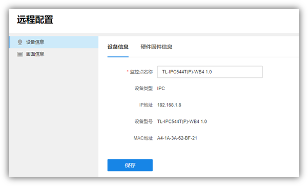 点击设备列表右边的“远程配置”进入到单台设备的远程配置界面,可实现设备信息、固件信息以及画面信息等功能设置,实现远程配置监控点位的参数信息。