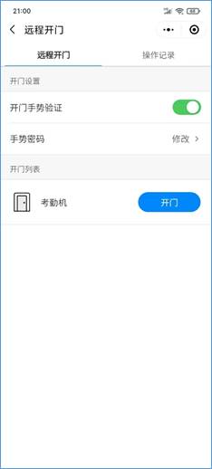 2、设置一个手势密码用于远程开门,下次进入此页面时,只需要正确绘制手势密码,即可直接远程开门(此人员在此时间段内有开门权限才能成功开门)。