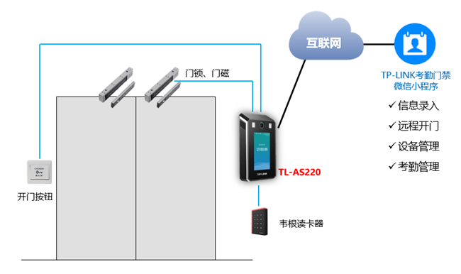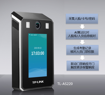 TL-AS220是内置1T AI算力的人脸识别智能终端,能够快速精准的采集人脸并进行实时比对,输出考勤记录、联动门禁开关门、报警及录像,是一款综合一体的控制设备。