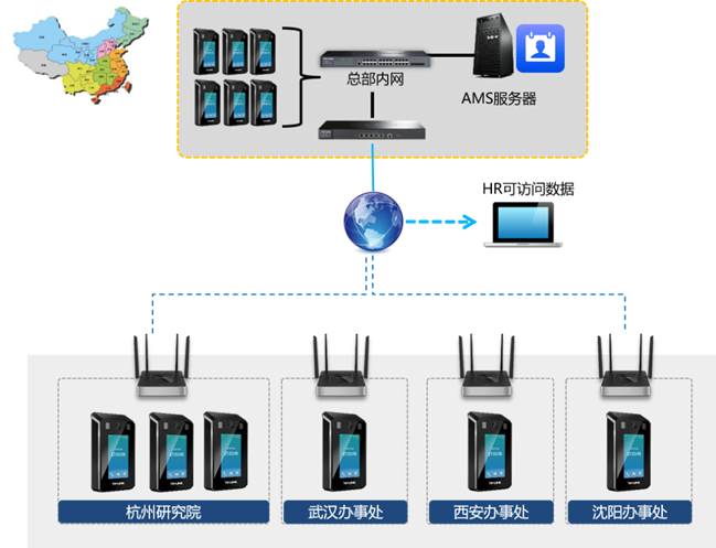 针对跨区域的企业需要集中考勤和门禁控制,可以通过私有云方案实现,AMS和考勤一体机构建私有云实现: