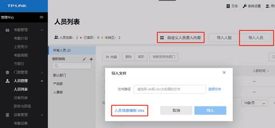 2、在弹出窗口中点击“人员信息模板”,下载模板后填写所有要导入的人员信息至表格中,然后点击“选择文件”,导入编辑好的人员信息表格。